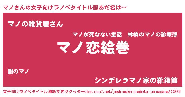 | 男性向けラノベタイトル風あだ名 | 『おまえをオタクにしてやるから、俺をマノにしてくれ! 』 |