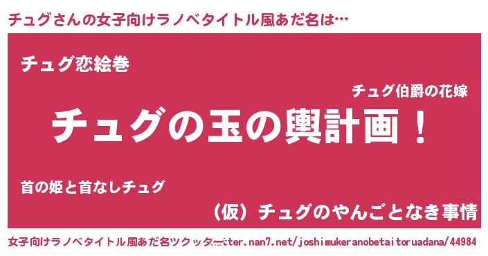 | 男性向けラノベタイトル風あだ名 | 『チュグ~年齢イコール彼女いない歴の魔法使い~』 |