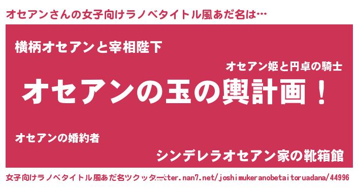 オセアンさんの女子向けラノベタイトル風あだ名は… 『オセアンの玉の輿計画!』『横柄オセアンと宰相陛下』『シンデレラオセアン家の靴箱館』 ツクッター #女子向けラノベタイトル風あだ名ツクッター http://tkutter.nan7.net/joshimukeranobetaitoruadana/44996/