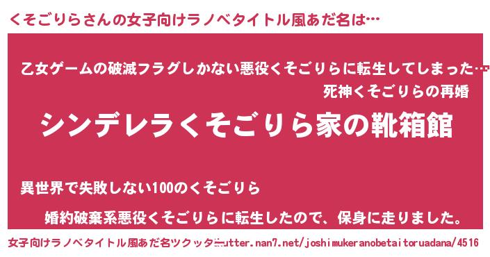 | 男性向けラノベタイトル風あだ名 | 『冴えないくそごりらの育てかた』 |
