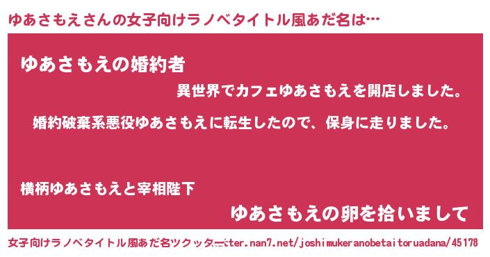 | 男性向けラノベタイトル風あだ名 | 『転生したらゆあさもえだった件』 |