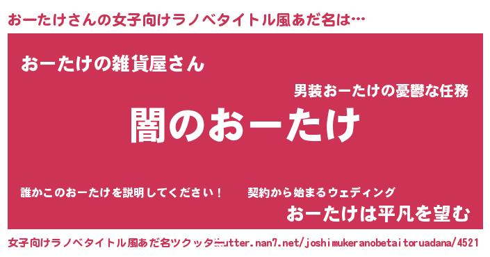 | 男性向けラノベタイトル風あだ名 | 『Re:おーたけから始める異世界生活』 |