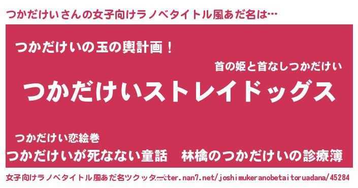 | 男性向けラノベタイトル風あだ名 | 『Re:つかだけいから始める異世界生活』 |