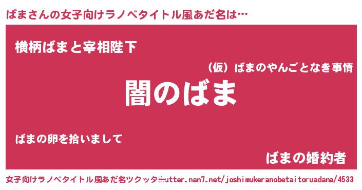 | 男性向けラノベタイトル風あだ名 | 『Re:ばまから始める異世界生活』 |