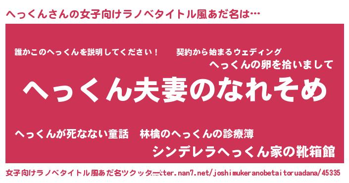 | 男性向けラノベタイトル風あだ名 | 『おまえをオタクにしてやるから、俺をへっくんにしてくれ! 』 |