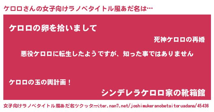 | 男性向けラノベタイトル風あだ名 | 『この素晴らしい世界にケロロを!』 |