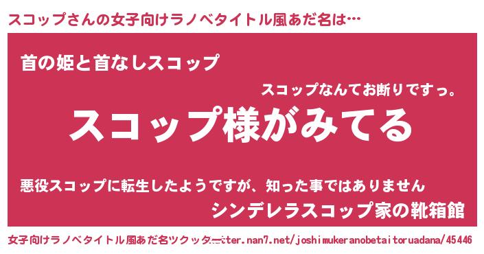 | 男性向けラノベタイトル風あだ名 | 『スコップの嫁は女の子じゃないと思った?』 |