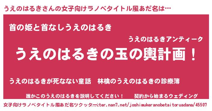 | 男性向けラノベタイトル風あだ名 | 『うえのはるき~年齢イコール彼女いない歴の魔法使い~』 |