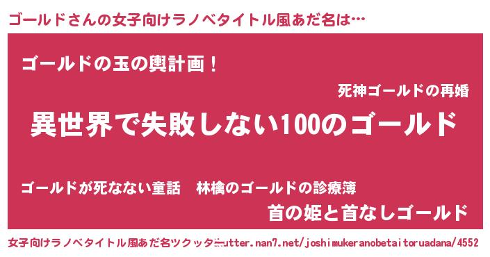 | 男性向けラノベタイトル風あだ名 | 『ゴールドという概念が存在しない退屈な世界 』 |