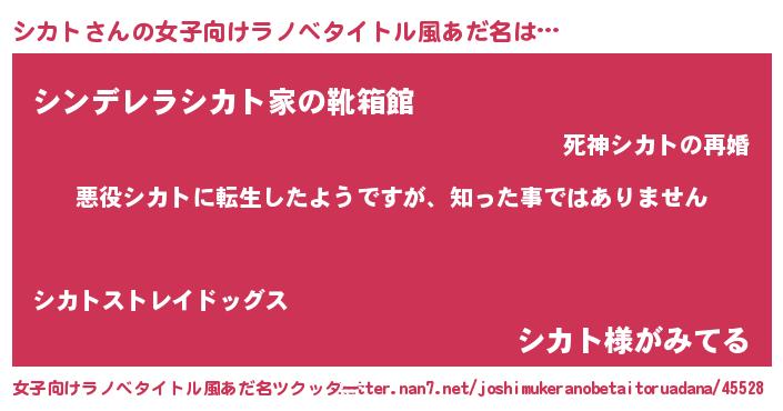 | 男性向けラノベタイトル風あだ名 | 『この素晴らしい世界にシカトを!』 |