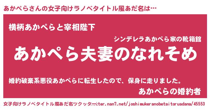 あかぺらさんの女子向けラノベタイトル風あだ名は… 『あかぺら夫妻のなれそめ』『横柄あかぺらと宰相陛下』『あかぺらの婚約者』 ツクッター #女子向けラノベタイトル風あだ名ツクッター http://tkutter.nan7.net/joshimukeranobetaitoruadana/45553/