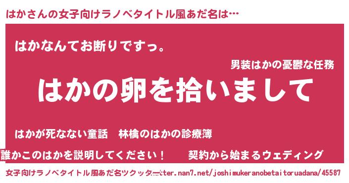 はかさんの女子向けラノベタイトル風あだ名は… 『はかの卵を拾いまして』『はかなんてお断りですっ。』『誰かこのはかを説明してください! ~契約から始まるウェディング~』 ツクッター #女子向けラノベタイトル風あだ名ツクッター http://tkutter.nan7.net/joshimukeranobetaitoruadana/45587/