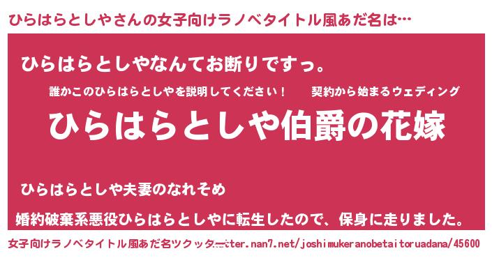 | 男性向けラノベタイトル風あだ名 | 『うちの娘の為ならば、俺はもしかしたらひらはらとしやも倒せるかもしれない。』 |