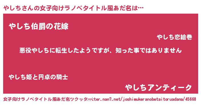 | 男性向けラノベタイトル風あだ名 | 『この素晴らしい世界にやしちを!』 |