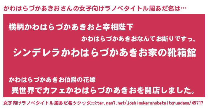 | 男性向けラノベタイトル風あだ名 | 『緋弾のカワハラヅカアキオ』 |