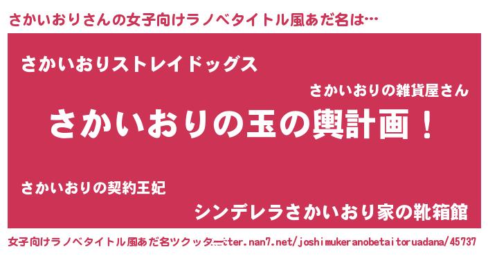 | 男性向けラノベタイトル風あだ名 | 『さかいおり~年齢イコール彼女いない歴の魔法使い~』 |