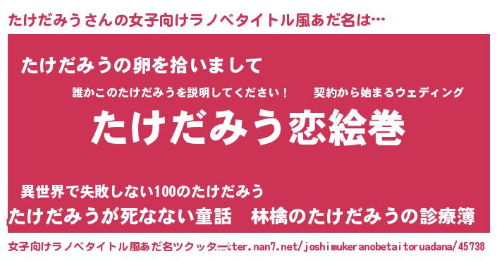 | 男性向けラノベタイトル風あだ名 | 『ノーゲーム・ノータケダミウ』 |