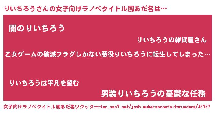 | 胡散臭い通販商品みたいなあだ名 | 『世界中を虜にした100年もののヴィンテージワイン…その名も「りいちろう」』 |