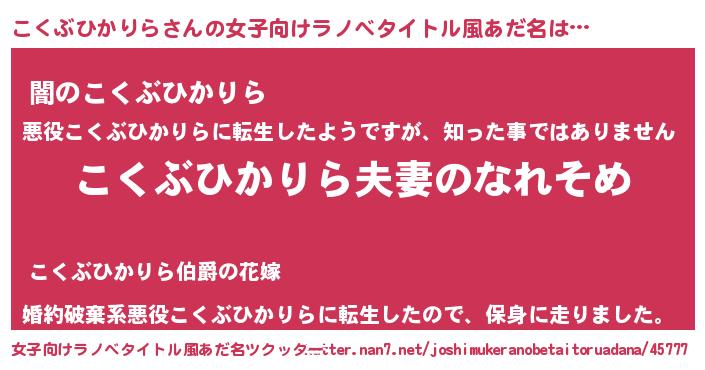 | 男性向けラノベタイトル風あだ名 | 『おまえをオタクにしてやるから、俺をこくぶひかりらにしてくれ! 』 |