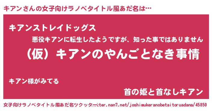 | 男性向けラノベタイトル風あだ名 | 『キアンの憂鬱』『はたらくキアンさま!』 |