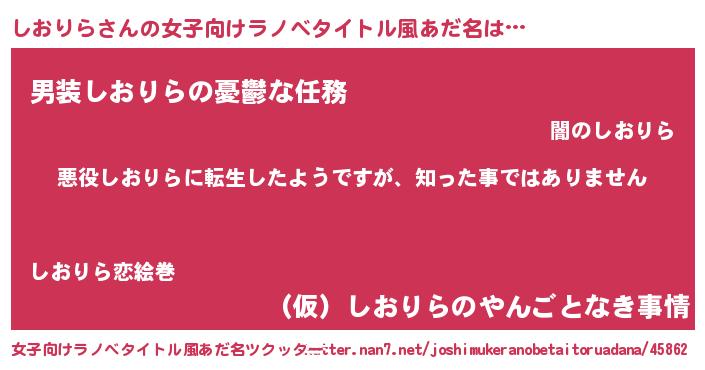 | 男性向けラノベタイトル風あだ名 | 『この素晴らしい世界にしおりらを!』 |