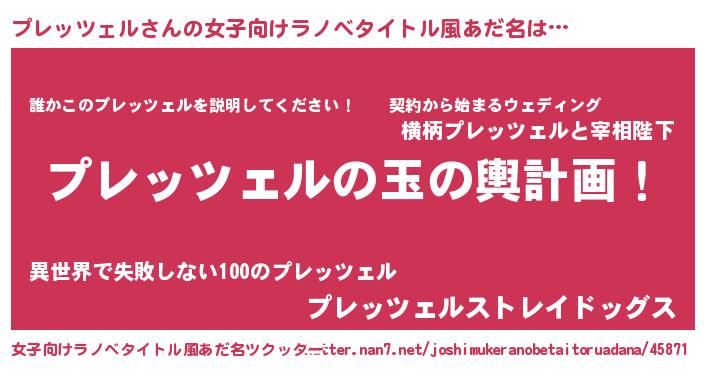 | 男性向けラノベタイトル風あだ名 | 『プレッツェル~年齢イコール彼女いない歴の魔法使い~』 |