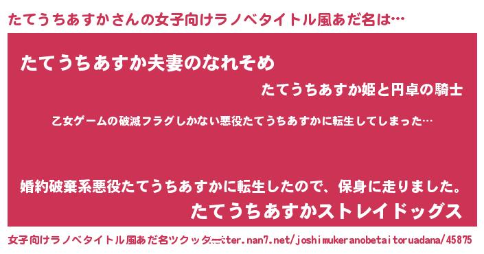 | 男性向けラノベタイトル風あだ名 | 『この素晴らしい世界にたてうちあすかを!』 |