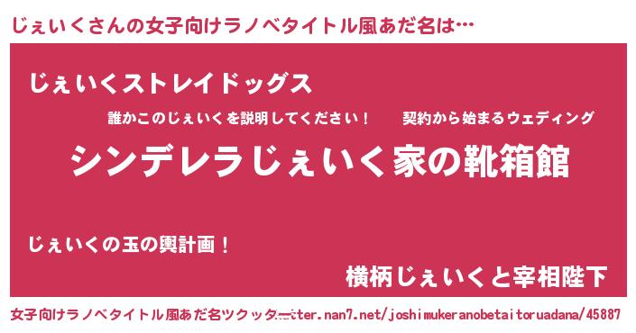 | 男性向けラノベタイトル風あだ名 | 『冴えないじぇいくの育てかた』 |