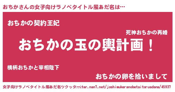 | 男性向けラノベタイトル風あだ名 | 『おちか~年齢イコール彼女いない歴の魔法使い~』 |