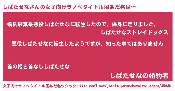 | 男性向けラノベタイトル風あだ名 | 『この素晴らしい世界にしばたせなを!』 |