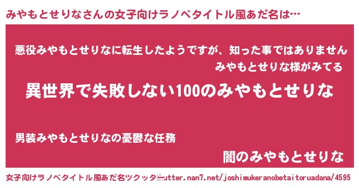| 男性向けラノベタイトル風あだ名 | 『みやもとせりなという概念が存在しない退屈な世界 』 |