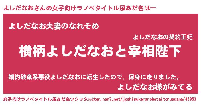 | 男性向けラノベタイトル風あだ名 | 『よしだなおに滅ぼされるだけの簡単なお仕事です』 |