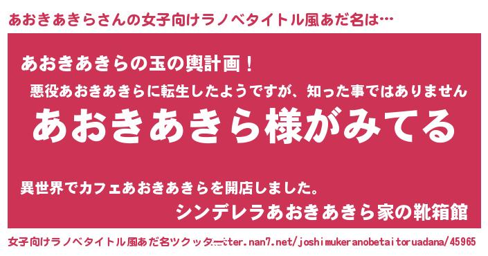| 男性向けラノベタイトル風あだ名 | 『あおきあきらの嫁は女の子じゃないと思った?』 |