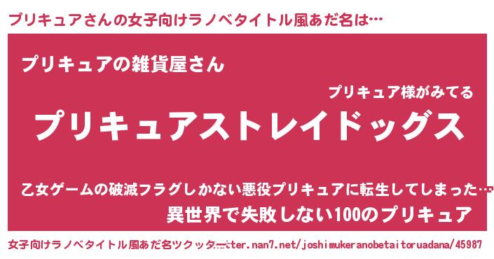 | 男性向けラノベタイトル風あだ名 | 『Re:プリキュアから始める異世界生活』 |