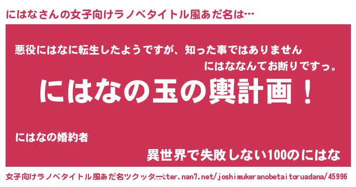 | 男性向けラノベタイトル風あだ名 | 『転生したらにはなだった件』 |