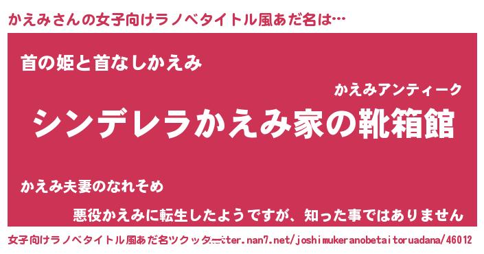 | 男性向けラノベタイトル風あだ名 | 『緋弾のカエミ』『はたらくかえみさま!』 |