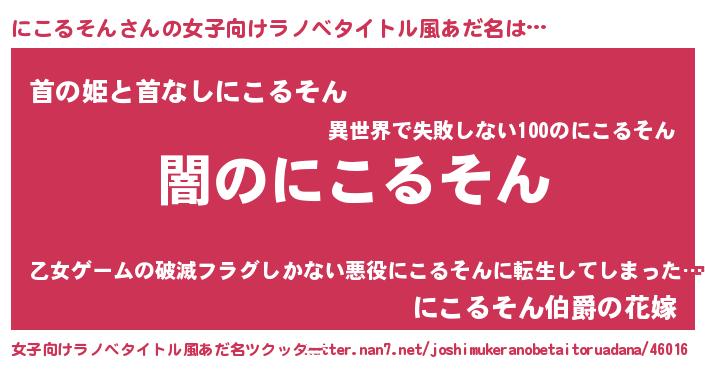 にこるそんさんの女子向けラノベタイトル風あだ名は… 『闇のにこるそん』『首の姫と首なしにこるそん』『にこるそん伯爵の花嫁』 ツクッター #女子向けラノベタイトル風あだ名ツクッター http://tkutter.nan7.net/joshimukeranobetaitoruadana/46016/