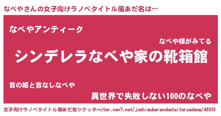 | 男性向けラノベタイトル風あだ名 | 『緋弾のナベヤ』『魔法科高校のなべや』 |