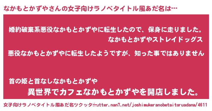 | 男性向けラノベタイトル風あだ名 | 『この素晴らしい世界になかもとかずやを!』 |