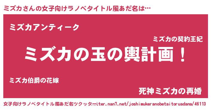ミズカさんの女子向けラノベタイトル風あだ名は… 『ミズカの玉の輿計画!』『ミズカアンティーク』『死神ミズカの再婚』 ツクッター #女子向けラノベタイトル風あだ名ツクッター http://tkutter.nan7.net/joshimukeranobetaitoruadana/46113/