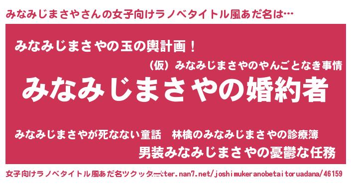 | 男性向けラノベタイトル風あだ名 | 『うちの娘の為ならば、俺はもしかしたらみなみじまさやも倒せるかもしれない。』 |