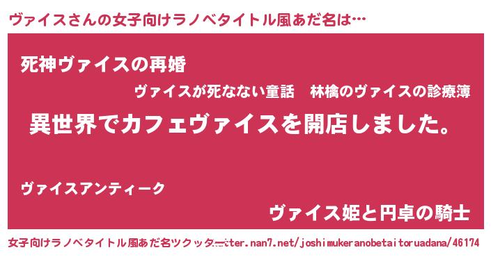ヴァイスさんの女子向けラノベタイトル風あだ名は… 『異世界でカフェヴァイスを開店しました。』『死神ヴァイスの再婚』『ヴァイス姫と円卓の騎士』 ツクッター #女子向けラノベタイトル風あだ名ツクッター http://tkutter.nan7.net/joshimukeranobetaitoruadana/46174/