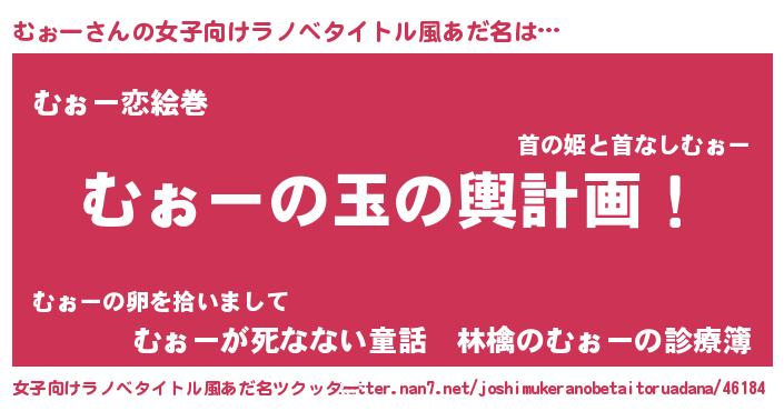 | 男性向けラノベタイトル風あだ名 | 『むぉー~年齢イコール彼女いない歴の魔法使い~』 |