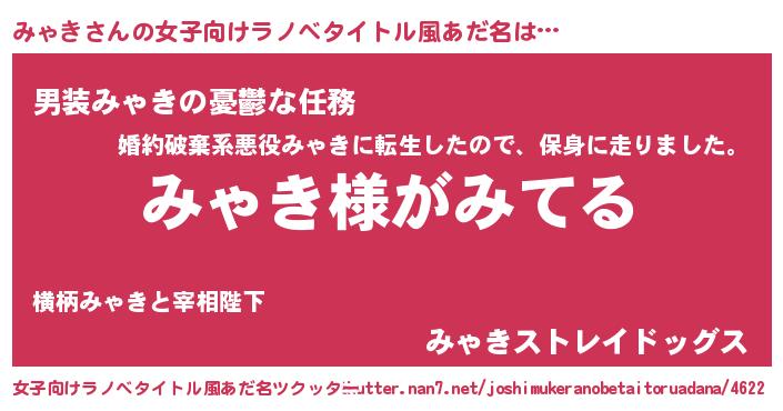 | 男性向けラノベタイトル風あだ名 | 『みゃきの嫁は女の子じゃないと思った?』 |