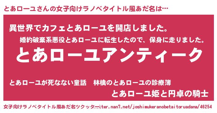 | 意味不明あだ名 | 『自称とあローユ』『永久保存とあローユ』 |
