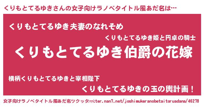 | 男性向けラノベタイトル風あだ名 | 『うちの娘の為ならば、俺はもしかしたらくりもとてるゆきも倒せるかもしれない。』 |
