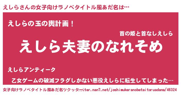 | 男性向けラノベタイトル風あだ名 | 『おまえをオタクにしてやるから、俺をえしらにしてくれ! 』 |