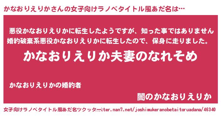 | 男性向けラノベタイトル風あだ名 | 『おまえをオタクにしてやるから、俺をかなおりえりかにしてくれ! 』 |