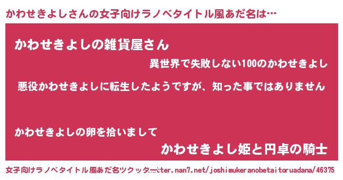 | 男性向けラノベタイトル風あだ名 | 『この素晴らしい世界にかわせきよしを!』 |
