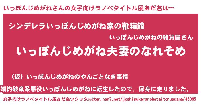 | 男性向けラノベタイトル風あだ名 | 『おまえをオタクにしてやるから、俺をいっぽんじめがねにしてくれ! 』 |